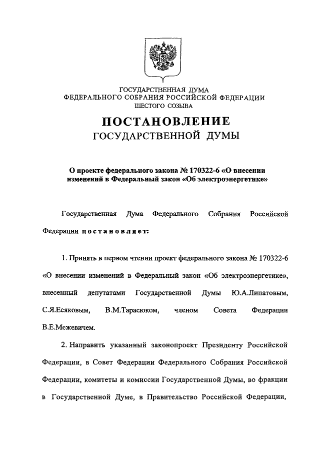 "О ПРОЕКТЕ ФЕДЕРАЛЬНОГО ЗАКОНА N 170322-6 "О ВНЕСЕНИИ ИЗМЕНЕНИЙ В ФЕДЕРАЛЬНЫЙ ЗАКОН "ОБ ЭЛЕКТРОЭНЕРГЕТИКЕ"