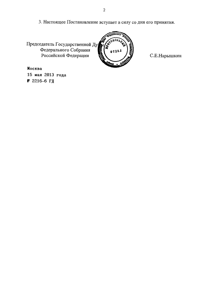 ПОСТАНОВЛЕНИЕ ГД ФС РФ от 15.05.2013 N 2216-6 ГД