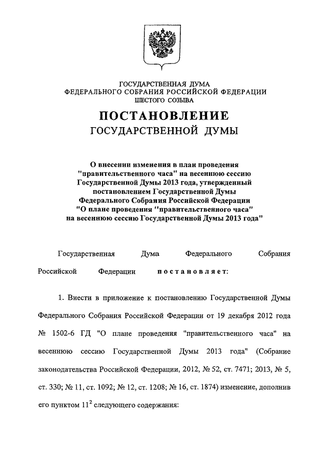НА ВЕСЕННЮЮ СЕССИЮ ГОСУДАРСТВЕННОЙ ДУМЫ 2013 ГОДА, УТВЕРЖДЕННЫЙ
