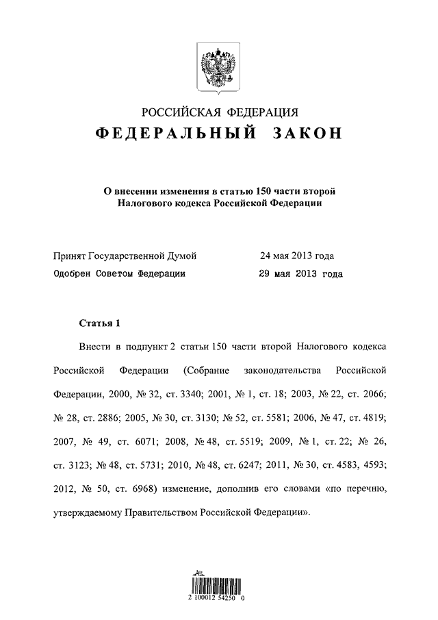 "О ВНЕСЕНИИ ИЗМЕНЕНИЯ В СТАТЬЮ 150 ЧАСТИ ВТОРОЙ НАЛОГОВОГО КОДЕКСА РОССИЙСКОЙ ФЕДЕРАЦИИ"