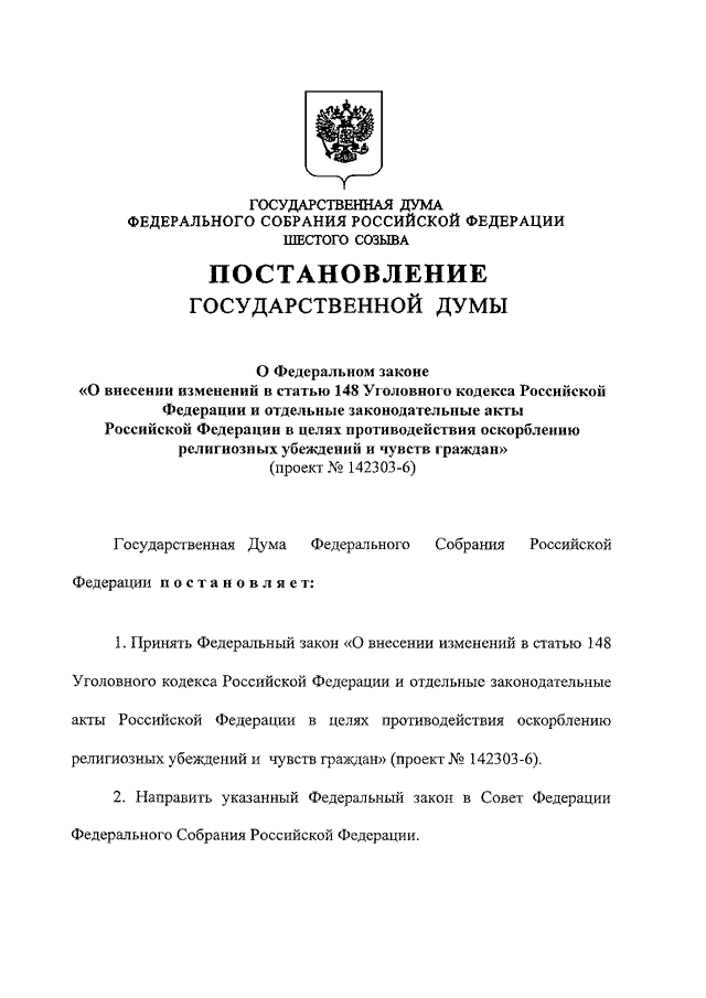 "О ФЕДЕРАЛЬНОМ ЗАКОНЕ "О ВНЕСЕНИИ ИЗМЕНЕНИЙ В СТАТЬЮ 148 УГОЛОВНОГО КОДЕКСА РОССИЙСКОЙ ФЕДЕРАЦИИ И ОТДЕЛЬНЫЕ ЗАКОНОДАТЕЛЬНЫЕ АКТЫ РОССИЙСКОЙ ФЕДЕРАЦИИ В ЦЕЛЯХ ПРОТИВОДЕЙСТВИЯ ОСКОРБЛЕНИЮ РЕЛИГИОЗНЫХ УБЕЖДЕНИЙ И ЧУВСТВ ГРАЖДАН" (ПРОЕКТ N 142303-6)"