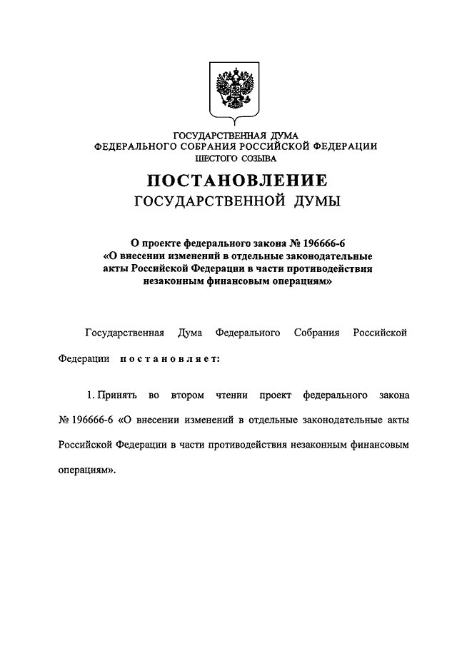 "О ПРОЕКТЕ ФЕДЕРАЛЬНОГО ЗАКОНА N 196666-6 "О ВНЕСЕНИИ ИЗМЕНЕНИЙ В ОТДЕЛЬНЫЕ ЗАКОНОДАТЕЛЬНЫЕ АКТЫ РОССИЙСКОЙ ФЕДЕРАЦИИ В ЧАСТИ ПРОТИВОДЕЙСТВИЯ НЕЗАКОННЫМ ФИНАНСОВЫМ ОПЕРАЦИЯМ"