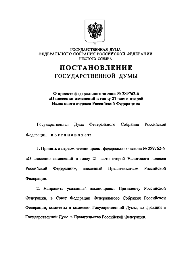 "О ПРОЕКТЕ ФЕДЕРАЛЬНОГО ЗАКОНА N 289762-6 "О ВНЕСЕНИИ ИЗМЕНЕНИЙ В ГЛАВУ 21 ЧАСТИ ВТОРОЙ НАЛОГОВОГО КОДЕКСА РОССИЙСКОЙ ФЕДЕРАЦИИ"