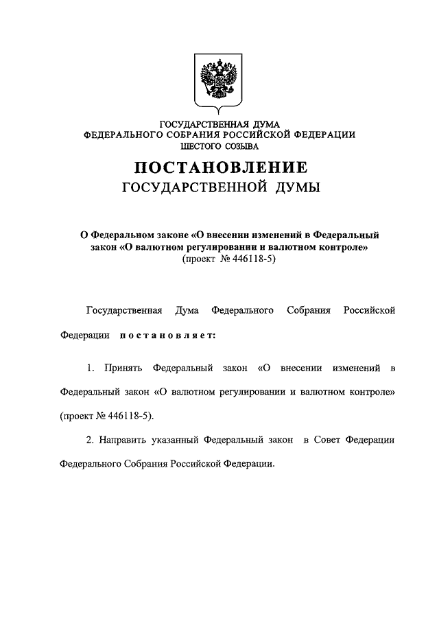 "О ФЕДЕРАЛЬНОМ ЗАКОНЕ "О ВНЕСЕНИИ ИЗМЕНЕНИЙ В ФЕДЕРАЛЬНЫЙ ЗАКОН "О ВАЛЮТНОМ РЕГУЛИРОВАНИИ И ВАЛЮТНОМ КОНТРОЛЕ" (ПРОЕКТ N 446118-5)"
