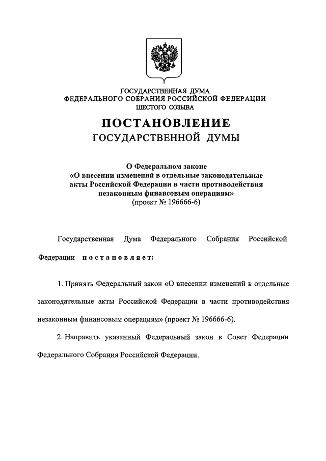 "О ФЕДЕРАЛЬНОМ ЗАКОНЕ "О ВНЕСЕНИИ ИЗМЕНЕНИЙ В ОТДЕЛЬНЫЕ ЗАКОНОДАТЕЛЬНЫЕ АКТЫ РОССИЙСКОЙ ФЕДЕРАЦИИ В ЧАСТИ ПРОТИВОДЕЙСТВИЯ НЕЗАКОННЫМ ФИНАНСОВЫМ ОПЕРАЦИЯМ" (ПРОЕКТ N 196666-6)"