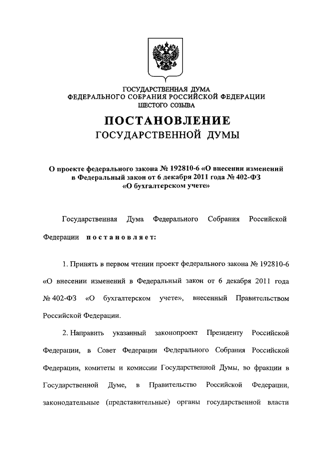 "О ПРОЕКТЕ ФЕДЕРАЛЬНОГО ЗАКОНА N 192810-6 "О ВНЕСЕНИИ ИЗМЕНЕНИЙ В ФЕДЕРАЛЬНЫЙ ЗАКОН ОТ 6 ДЕКАБРЯ 2011 Г. N 402-ФЗ "О БУХГАЛТЕРСКОМ УЧЕТЕ"