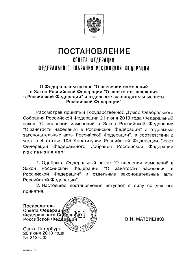 ПОСТАНОВЛЕНИЕ СФ ФС РФ от 26.06.2013 N 212-СФ