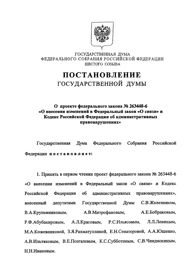 "О ПРОЕКТЕ ФЕДЕРАЛЬНОГО ЗАКОНА N 263448-6 "О ВНЕСЕНИИ ИЗМЕНЕНИЙ В ФЕДЕРАЛЬНЫЙ ЗАКОН "О СВЯЗИ" И КОДЕКС РОССИЙСКОЙ ФЕДЕРАЦИИ ОБ АДМИНИСТРАТИВНЫХ ПРАВОНАРУШЕНИЯХ"