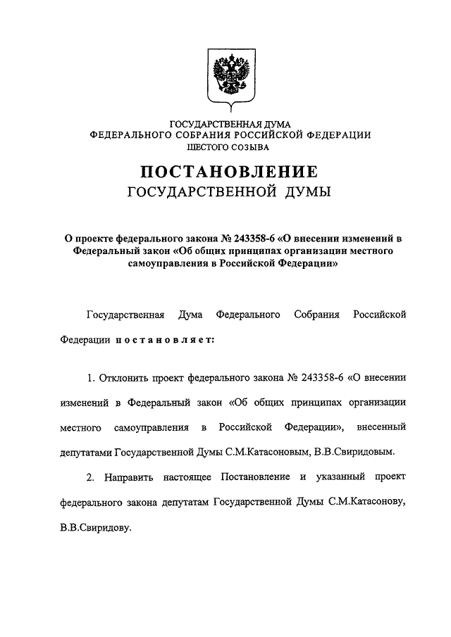 "О ПРОЕКТЕ ФЕДЕРАЛЬНОГО ЗАКОНА N 243358-6 "О ВНЕСЕНИИ ИЗМЕНЕНИЙ В ФЕДЕРАЛЬНЫЙ ЗАКОН "ОБ ОБЩИХ ПРИНЦИПАХ ОРГАНИЗАЦИИ МЕСТНОГО САМОУПРАВЛЕНИЯ В РОССИЙСКОЙ ФЕДЕРАЦИИ"