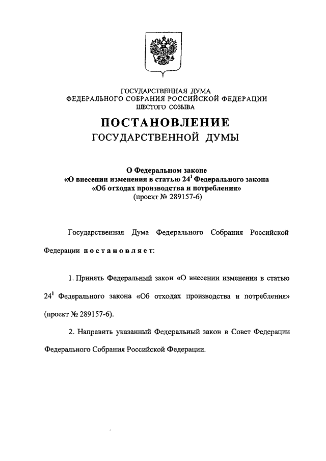 "О ФЕДЕРАЛЬНОМ ЗАКОНЕ "О ВНЕСЕНИИ ИЗМЕНЕНИЯ В СТАТЬЮ 24.1 ФЕДЕРАЛЬНОГО ЗАКОНА "ОБ ОТХОДАХ ПРОИЗВОДСТВА И ПОТРЕБЛЕНИЯ" (ПРОЕКТ N 289157-6)"
