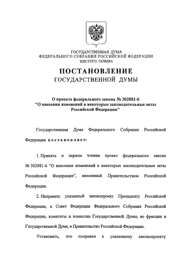 "О ПРОЕКТЕ ФЕДЕРАЛЬНОГО ЗАКОНА N 302881-6 "О ВНЕСЕНИИ ИЗМЕНЕНИЙ В НЕКОТОРЫЕ ЗАКОНОДАТЕЛЬНЫЕ АКТЫ РОССИЙСКОЙ ФЕДЕРАЦИИ"