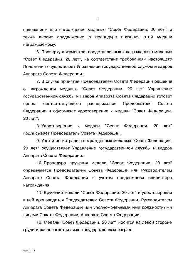 "О МЕДАЛИ "СОВЕТ ФЕДЕРАЦИИ. 20 ЛЕТ"