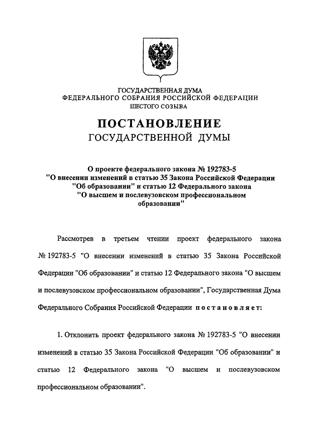 "О ПРОЕКТЕ ФЕДЕРАЛЬНОГО ЗАКОНА N 192783-5 "О ВНЕСЕНИИ ИЗМЕНЕНИЙ В СТАТЬЮ 35 ЗАКОНА РОССИЙСКОЙ ФЕДЕРАЦИИ "ОБ ОБРАЗОВАНИИ" И СТАТЬЮ 12 ФЕДЕРАЛЬНОГО ЗАКОНА "О ВЫСШЕМ И ПОСЛЕВУЗОВСКОМ ПРОФЕССИОНАЛЬНОМ ОБРАЗОВАНИИ"