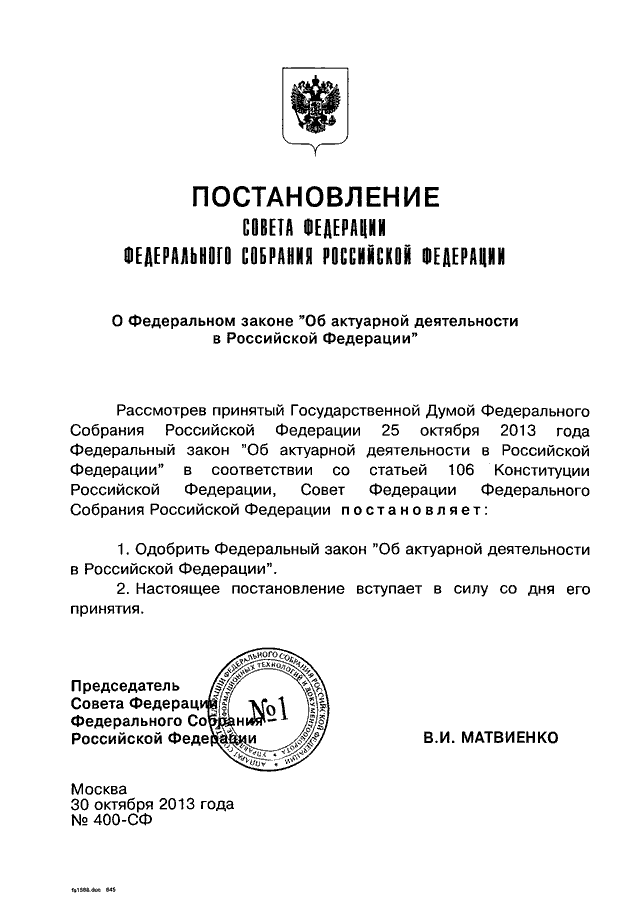 ПОСТАНОВЛЕНИЕ СФ ФС РФ от 30.10.2013 N 400-СФ