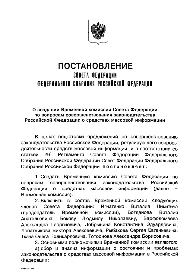 "О СОЗДАНИИ ВРЕМЕННОЙ КОМИССИИ СОВЕТА ФЕДЕРАЦИИ ПО ВОПРОСАМ СОВЕРШЕНСТВОВАНИЯ ЗАКОНОДАТЕЛЬСТВА РОССИЙСКОЙ ФЕДЕРАЦИИ О СРЕДСТВАХ МАССОВОЙ ИНФОРМАЦИИ"