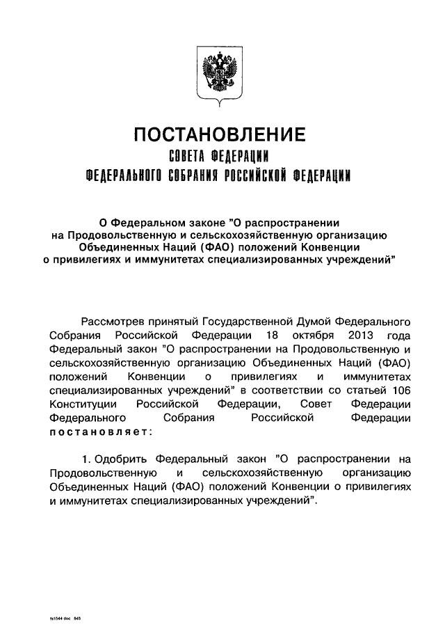 "О ФЕДЕРАЛЬНОМ ЗАКОНЕ "О РАСПРОСТРАНЕНИИ НА ПРОДОВОЛЬСТВЕННУЮ И СЕЛЬСКОХОЗЯЙСТВЕННУЮ ОРГАНИЗАЦИЮ ОБЪЕДИНЕННЫХ НАЦИЙ (ФАО) ПОЛОЖЕНИЙ КОНВЕНЦИИ О ПРИВИЛЕГИЯХ И ИММУНИТЕТАХ СПЕЦИАЛИЗИРОВАННЫХ УЧРЕЖДЕНИЙ"