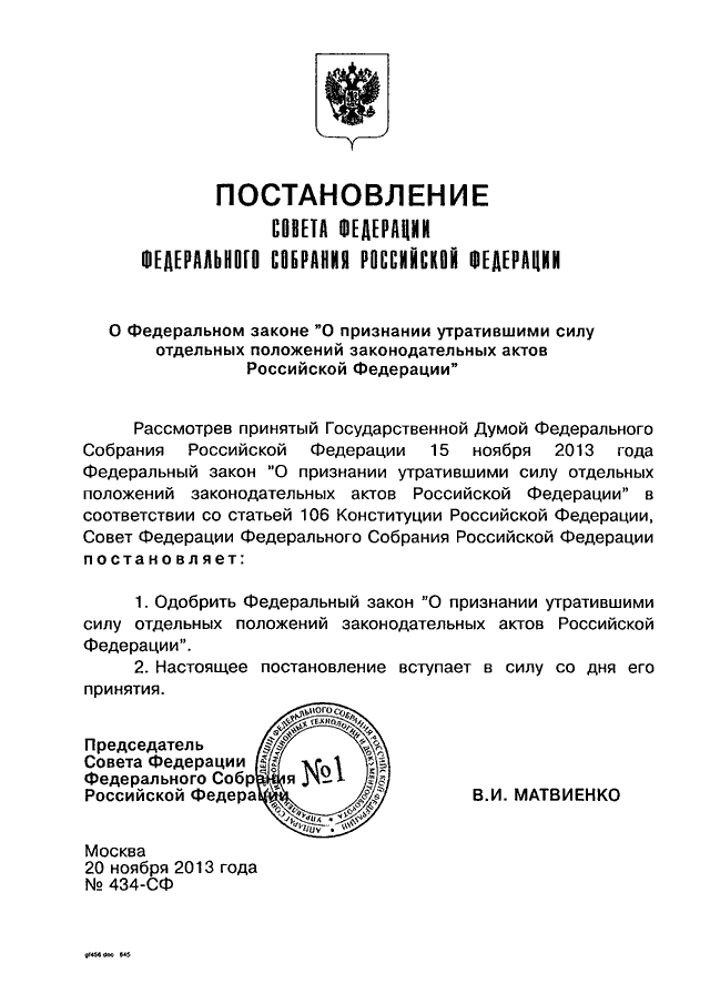 ПОСТАНОВЛЕНИЕ СФ ФС РФ от 20.11.2013 N 434-СФ
