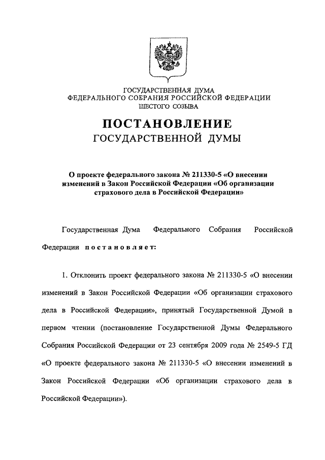 "О ПРОЕКТЕ ФЕДЕРАЛЬНОГО ЗАКОНА N 211330-5 "О ВНЕСЕНИИ ИЗМЕНЕНИЙ В ЗАКОН РОССИЙСКОЙ ФЕДЕРАЦИИ "ОБ ОРГАНИЗАЦИИ СТРАХОВОГО ДЕЛА В РОССИЙСКОЙ ФЕДЕРАЦИИ"