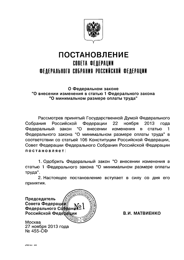 ПОСТАНОВЛЕНИЕ СФ ФС РФ от 27.11.2013 N 455-СФ
