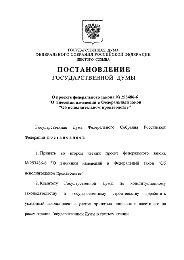 "О ПРОЕКТЕ ФЕДЕРАЛЬНОГО ЗАКОНА N 293486-6 "О ВНЕСЕНИИ ИЗМЕНЕНИЙ В ФЕДЕРАЛЬНЫЙ ЗАКОН "ОБ ИСПОЛНИТЕЛЬНОМ ПРОИЗВОДСТВЕ"