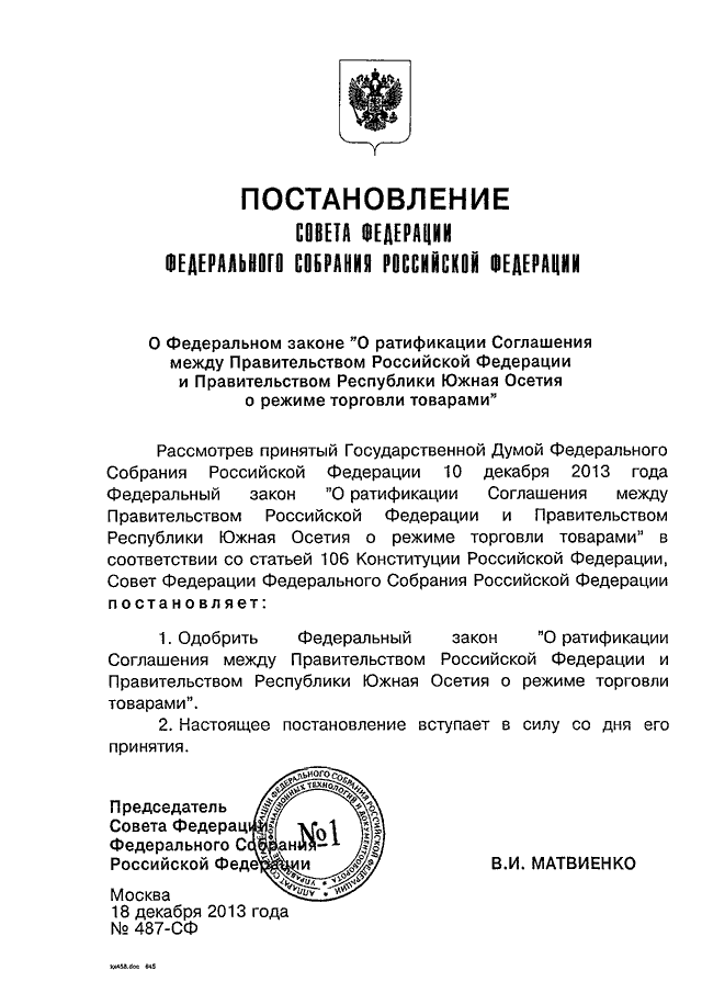 ПОСТАНОВЛЕНИЕ СФ ФС РФ от 18.12.2013 N 487-СФ