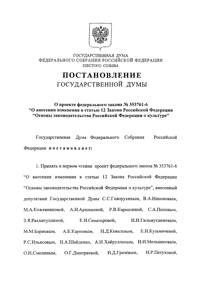 "О ПРОЕКТЕ ФЕДЕРАЛЬНОГО ЗАКОНА N 353761-6 "О ВНЕСЕНИИ ИЗМЕНЕНИЯ В СТАТЬЮ 12 ЗАКОНА РОССИЙСКОЙ ФЕДЕРАЦИИ "ОСНОВЫ ЗАКОНОДАТЕЛЬСТВА РОССИЙСКОЙ ФЕДЕРАЦИИ О КУЛЬТУРЕ"