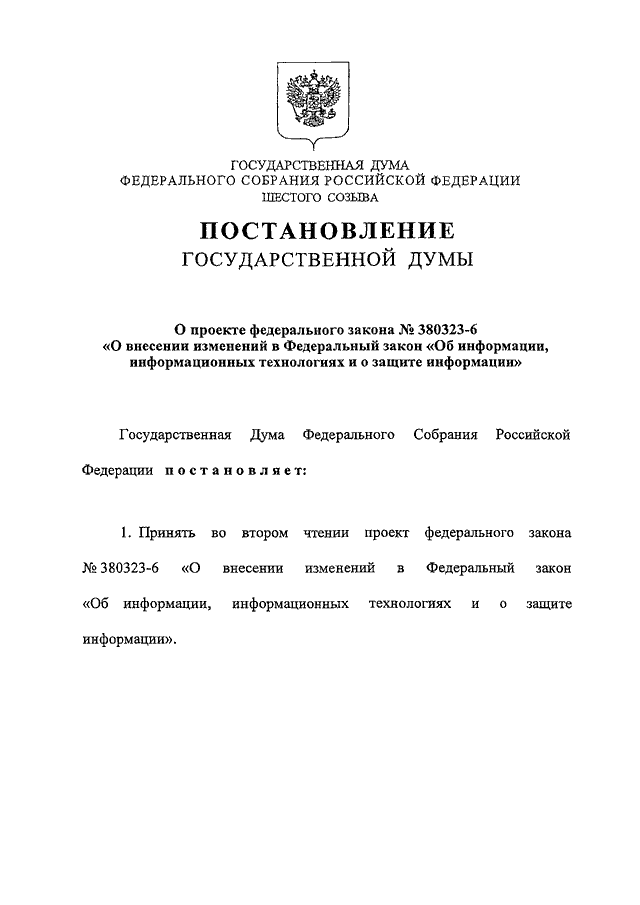 "О ПРОЕКТЕ ФЕДЕРАЛЬНОГО ЗАКОНА N 380323-6 "О ВНЕСЕНИИ ИЗМЕНЕНИЙ В ФЕДЕРАЛЬНЫЙ ЗАКОН "ОБ ИНФОРМАЦИИ, ИНФОРМАЦИОННЫХ ТЕХНОЛОГИЯХ И О ЗАЩИТЕ ИНФОРМАЦИИ"