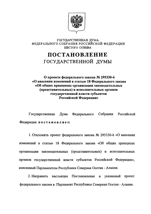 "О ПРОЕКТЕ ФЕДЕРАЛЬНОГО ЗАКОНА N 295330-6 "О ВНЕСЕНИИ ИЗМЕНЕНИЙ В СТАТЬЮ 18 ФЕДЕРАЛЬНОГО ЗАКОНА "ОБ ОБЩИХ ПРИНЦИПАХ ОРГАНИЗАЦИИ ЗАКОНОДАТЕЛЬНЫХ (ПРЕДСТАВИТЕЛЬНЫХ) И ИСПОЛНИТЕЛЬНЫХ ОРГАНОВ ГОСУДАРСТВЕННОЙ ВЛАСТИ СУБЪЕКТОВ РОССИЙСКОЙ ФЕДЕРАЦИИ"