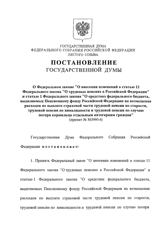 "О ФЕДЕРАЛЬНОМ ЗАКОНЕ "О ВНЕСЕНИИ ИЗМЕНЕНИЙ В СТАТЬЮ 11 ФЕДЕРАЛЬНОГО ЗАКОНА "О ТРУДОВЫХ ПЕНСИЯХ В РОССИЙСКОЙ ФЕДЕРАЦИИ" И СТАТЬЮ 1 ФЕДЕРАЛЬНОГО ЗАКОНА "О СРЕДСТВАХ ФЕДЕРАЛЬНОГО БЮДЖЕТА, ВЫДЕЛЯЕМЫХ ПЕНСИОННОМУ ФОНДУ РОССИЙСКОЙ ФЕДЕРАЦИИ НА ВОЗМЕЩЕНИЕ РАСХОДОВ ПО ВЫПЛАТЕ СТРАХОВОЙ ЧАСТИ ТРУДОВОЙ ПЕНСИИ ПО СТАРОСТИ, ТРУДОВОЙ ПЕНСИИ ПО ИНВАЛИДНОСТИ И ТРУДОВОЙ ПЕНСИИ ПО СЛУЧАЮ ПОТЕРИ КОРМИЛЬЦА ОТДЕЛЬНЫМ КАТЕГОРИЯМ ГРАЖДАН" (ПРОЕКТ N 363990-6)"