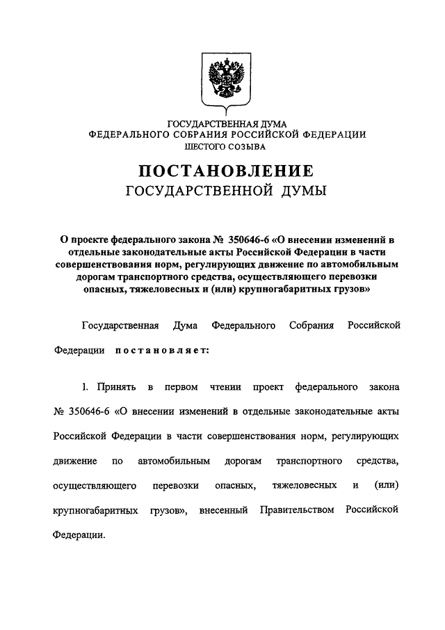 "О ПРОЕКТЕ ФЕДЕРАЛЬНОГО ЗАКОНА N 350646-6 "О ВНЕСЕНИИ ИЗМЕНЕНИЙ В ОТДЕЛЬНЫЕ ЗАКОНОДАТЕЛЬНЫЕ АКТЫ РОССИЙСКОЙ ФЕДЕРАЦИИ В ЧАСТИ СОВЕРШЕНСТВОВАНИЯ НОРМ, РЕГУЛИРУЮЩИХ ДВИЖЕНИЕ ПО АВТОМОБИЛЬНЫМ ДОРОГАМ ТРАНСПОРТНОГО СРЕДСТВА, ОСУЩЕСТВЛЯЮЩЕГО ПЕРЕВОЗКИ ОПАСНЫХ, ТЯЖЕЛОВЕСНЫХ И (ИЛИ) КРУПНОГАБАРИТНЫХ ГРУЗОВ"
