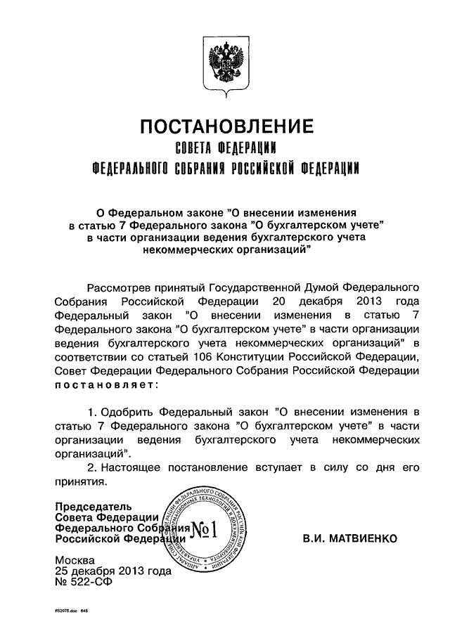 ПОСТАНОВЛЕНИЕ СФ ФС РФ от 25.12.2013 N 522-СФ