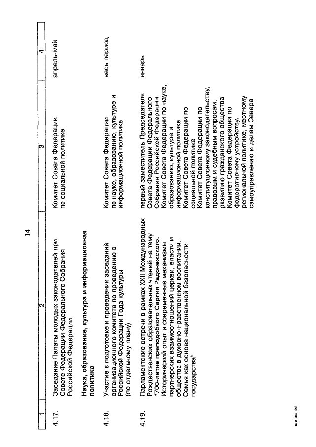 "О ПЛАНЕ МЕРОПРИЯТИЙ СОВЕТА ФЕДЕРАЦИИ ФЕДЕРАЛЬНОГО СОБРАНИЯ РОССИЙСКОЙ ФЕДЕРАЦИИ НА ВЕСЕННЮЮ СЕССИЮ 2014 ГОДА"