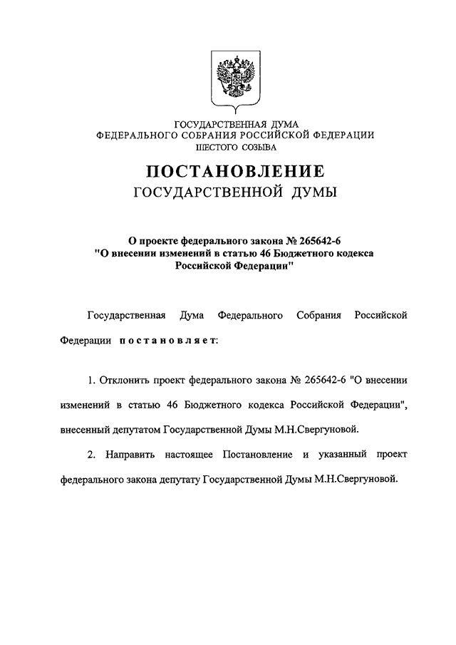 "О ПРОЕКТЕ ФЕДЕРАЛЬНОГО ЗАКОНА N 265642-6 "О ВНЕСЕНИИ ИЗМЕНЕНИЙ В СТАТЬЮ 46 БЮДЖЕТНОГО КОДЕКСА РОССИЙСКОЙ ФЕДЕРАЦИИ"