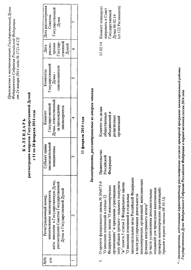 "О КАЛЕНДАРЕ РАССМОТРЕНИЯ ВОПРОСОВ ГОСУДАРСТВЕННОЙ ДУМОЙ С 11 ПО 28 ФЕВРАЛЯ 2014 ГОДА"