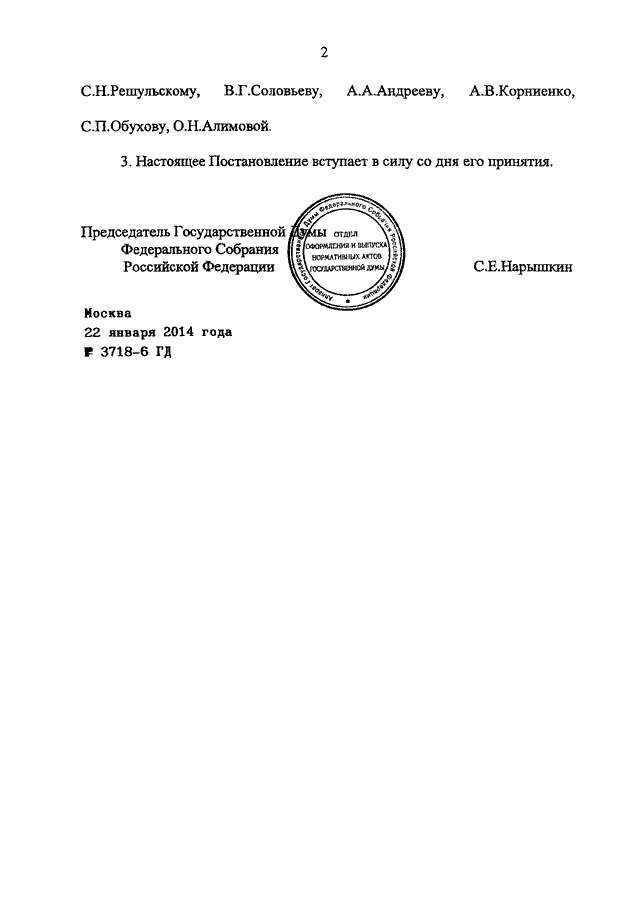 ПОСТАНОВЛЕНИЕ ГД ФС РФ от 22.01.2014 N 3718-6 ГД