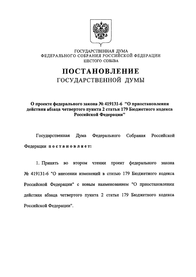 "О ПРОЕКТЕ ФЕДЕРАЛЬНОГО ЗАКОНА N 419131-6 "О ПРИОСТАНОВЛЕНИИ ДЕЙСТВИЯ АБЗАЦА ЧЕТВЕРТОГО ПУНКТА 2 СТАТЬИ 179 БЮДЖЕТНОГО КОДЕКСА РОССИЙСКОЙ ФЕДЕРАЦИИ"