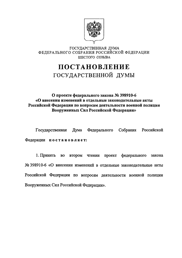 "О ПРОЕКТЕ ФЕДЕРАЛЬНОГО ЗАКОНА N 398910-6 "О ВНЕСЕНИИ ИЗМЕНЕНИЙ В ОТДЕЛЬНЫЕ ЗАКОНОДАТЕЛЬНЫЕ АКТЫ РОССИЙСКОЙ ФЕДЕРАЦИИ ПО ВОПРОСАМ ДЕЯТЕЛЬНОСТИ ВОЕННОЙ ПОЛИЦИИ ВООРУЖЕННЫХ СИЛ РОССИЙСКОЙ ФЕДЕРАЦИИ"