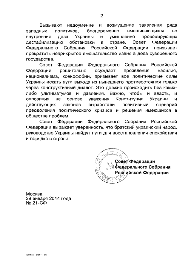 ЗАЯВЛЕНИЕ СФ ФС РФ от 29.01.2014 N 21-СФ