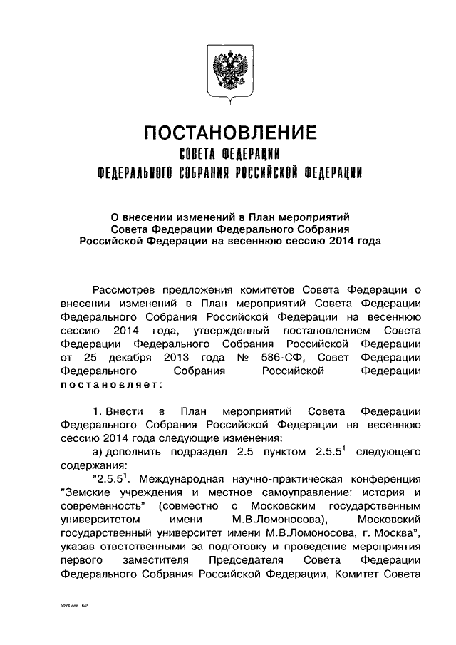 "О ВНЕСЕНИИ ИЗМЕНЕНИЙ В ПЛАН МЕРОПРИЯТИЙ СОВЕТА ФЕДЕРАЦИИ ФЕДЕРАЛЬНОГО СОБРАНИЯ РОССИЙСКОЙ ФЕДЕРАЦИИ НА ВЕСЕННЮЮ СЕССИЮ 2014 ГОДА"
