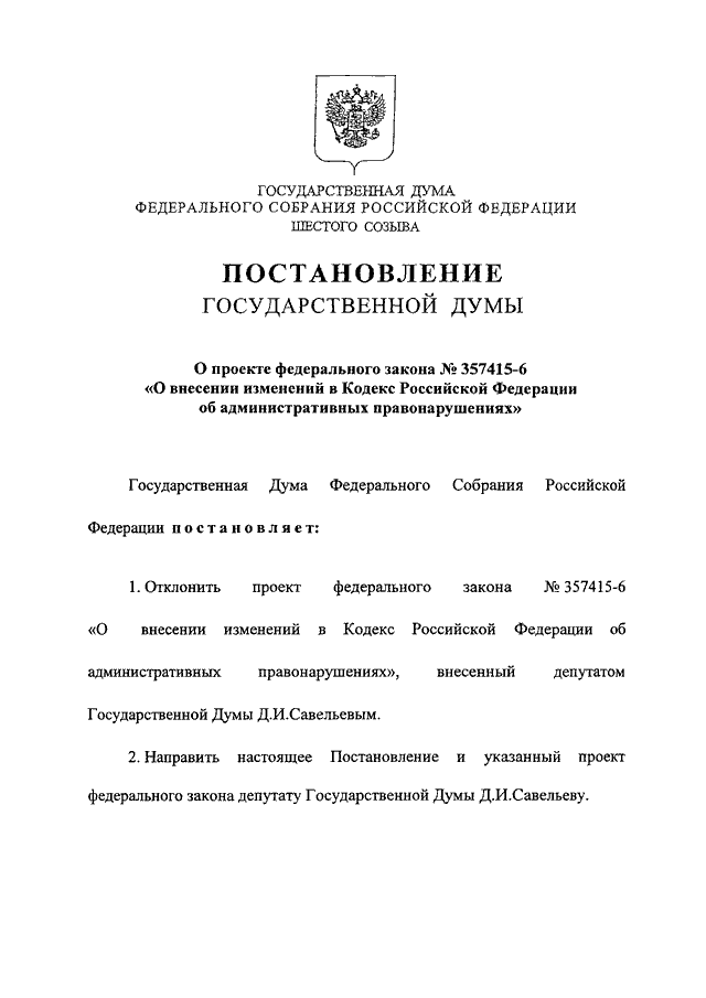 "О ПРОЕКТЕ ФЕДЕРАЛЬНОГО ЗАКОНА N 357415-6 "О ВНЕСЕНИИ ИЗМЕНЕНИЙ В КОДЕКС РОССИЙСКОЙ ФЕДЕРАЦИИ ОБ АДМИНИСТРАТИВНЫХ ПРАВОНАРУШЕНИЯХ"