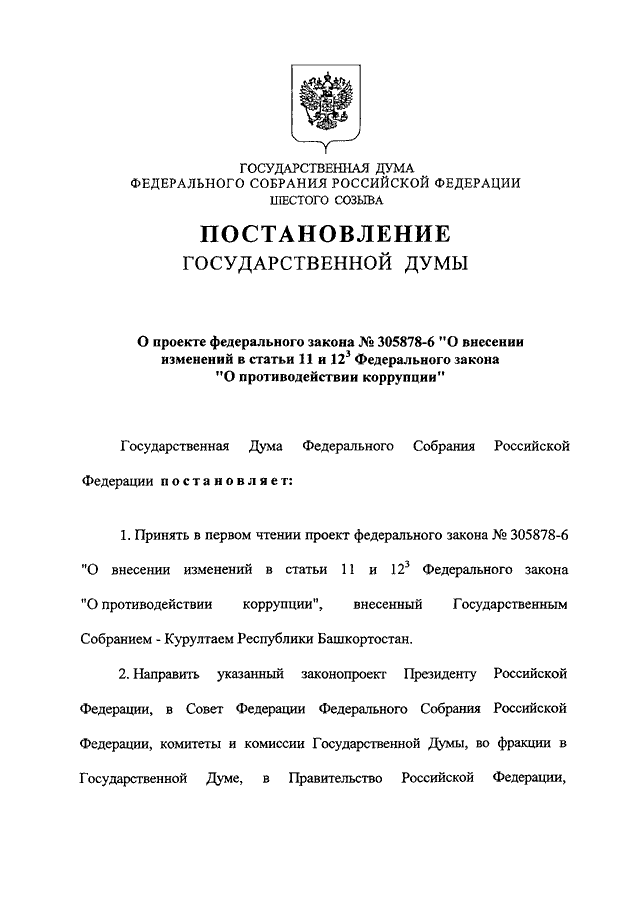 "О ПРОЕКТЕ ФЕДЕРАЛЬНОГО ЗАКОНА N 305878-6 "О ВНЕСЕНИИ ИЗМЕНЕНИЙ В СТАТЬИ 11 И 12.3 ФЕДЕРАЛЬНОГО ЗАКОНА "О ПРОТИВОДЕЙСТВИИ КОРРУПЦИИ"