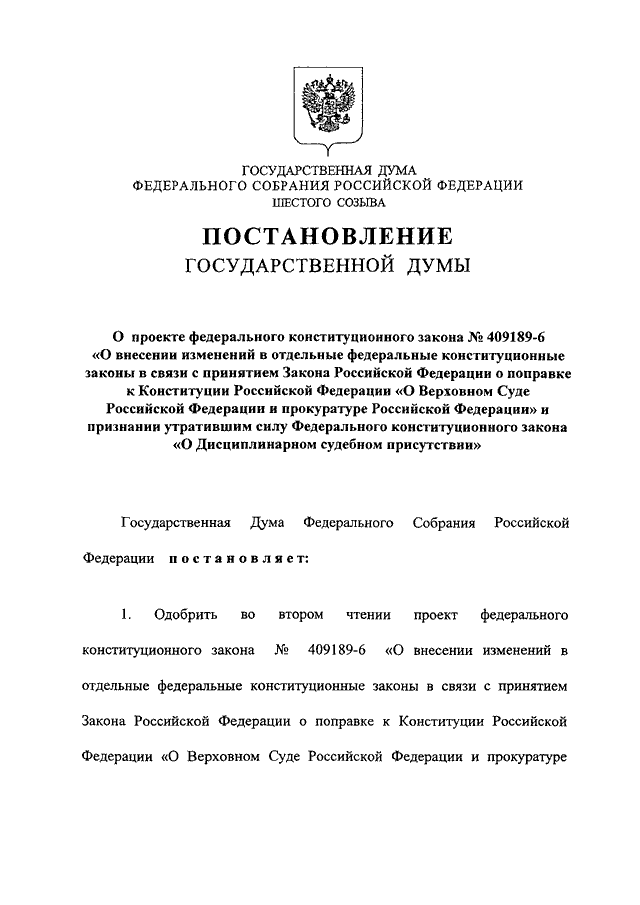 "О ПРОЕКТЕ ФЕДЕРАЛЬНОГО КОНСТИТУЦИОННОГО ЗАКОНА N 409189-6 "О
