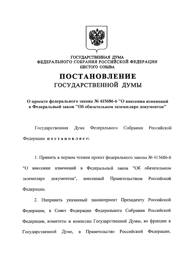 "О ПРОЕКТЕ ФЕДЕРАЛЬНОГО ЗАКОНА N 415686-6 "О ВНЕСЕНИИ ИЗМЕНЕНИЙ В ФЕДЕРАЛЬНЫЙ ЗАКОН "ОБ ОБЯЗАТЕЛЬНОМ ЭКЗЕМПЛЯРЕ ДОКУМЕНТОВ"