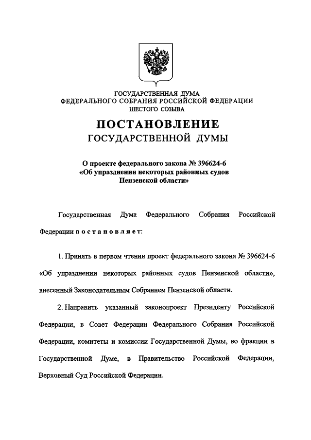 "О ПРОЕКТЕ ФЕДЕРАЛЬНОГО ЗАКОНА N 396624-6 "ОБ УПРАЗДНЕНИИ НЕКОТОРЫХ РАЙОННЫХ СУДОВ ПЕНЗЕНСКОЙ ОБЛАСТИ"