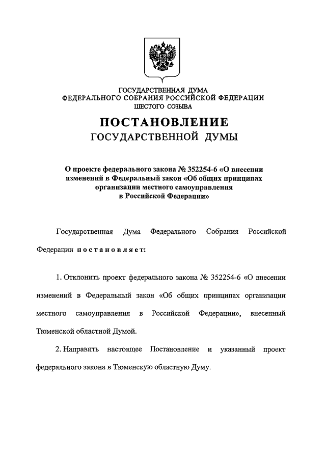 "О ПРОЕКТЕ ФЕДЕРАЛЬНОГО ЗАКОНА N 352254-6 "О ВНЕСЕНИИ ИЗМЕНЕНИЙ В ФЕДЕРАЛЬНЫЙ ЗАКОН "ОБ ОБЩИХ ПРИНЦИПАХ ОРГАНИЗАЦИИ МЕСТНОГО САМОУПРАВЛЕНИЯ В РОССИЙСКОЙ ФЕДЕРАЦИИ"