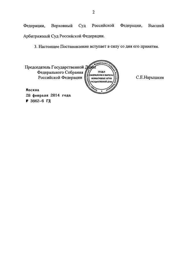 ПОСТАНОВЛЕНИЕ ГД ФС РФ от 28.02.2014 N 3862-6 ГД
