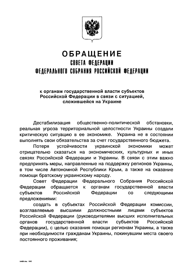 "ОБ ОБРАЩЕНИИ СОВЕТА ФЕДЕРАЦИИ ФЕДЕРАЛЬНОГО СОБРАНИЯ РОССИЙСКОЙ ФЕДЕРАЦИИ К ОРГАНАМ ГОСУДАРСТВЕННОЙ ВЛАСТИ СУБЪЕКТОВ РОССИЙСКОЙ ФЕДЕРАЦИИ В СВЯЗИ С СИТУАЦИЕЙ, СЛОЖИВШЕЙСЯ НА УКРАИНЕ"