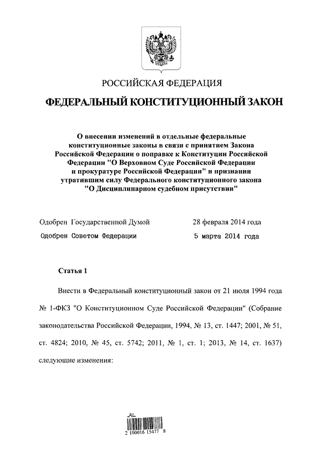 "О ВНЕСЕНИИ ИЗМЕНЕНИЙ В ОТДЕЛЬНЫЕ ФЕДЕРАЛЬНЫЕ КОНСТИТУЦИОННЫЕ ЗАКОНЫ В СВЯЗИ С ПРИНЯТИЕМ ЗАКОНА РОССИЙСКОЙ ФЕДЕРАЦИИ О ПОПРАВКЕ К КОНСТИТУЦИИ РОССИЙСКОЙ ФЕДЕРАЦИИ "О ВЕРХОВНОМ СУДЕ РОССИЙСКОЙ ФЕДЕРАЦИИ И ПРОКУРАТУРЕ РОССИЙСКОЙ ФЕДЕРАЦИИ" И ПРИЗНАНИИ УТРАТИВШИМ СИЛУ ФЕДЕРАЛЬНОГО КОНСТИТУЦИОННОГО ЗАКОНА "О ДИСЦИПЛИНАРНОМ СУДЕБНОМ ПРИСУТСТВИИ"