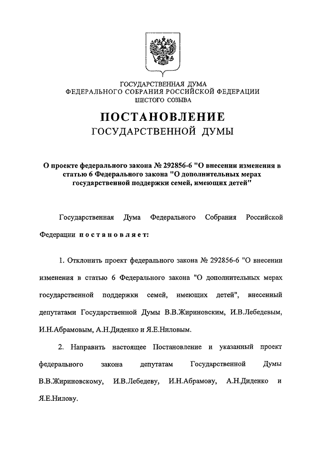"О ПРОЕКТЕ ФЕДЕРАЛЬНОГО ЗАКОНА N 292856-6 "О ВНЕСЕНИИ ИЗМЕНЕНИЯ В СТАТЬЮ 6 ФЕДЕРАЛЬНОГО ЗАКОНА "О ДОПОЛНИТЕЛЬНЫХ МЕРАХ ГОСУДАРСТВЕННОЙ ПОДДЕРЖКИ СЕМЕЙ, ИМЕЮЩИХ ДЕТЕЙ"