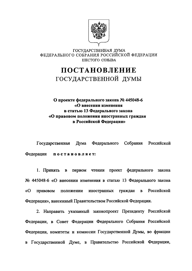 "О ПРОЕКТЕ ФЕДЕРАЛЬНОГО ЗАКОНА N 445048-6 "О ВНЕСЕНИИ ИЗМЕНЕНИЯ В СТАТЬЮ 13 ФЕДЕРАЛЬНОГО ЗАКОНА "О ПРАВОВОМ ПОЛОЖЕНИИ ИНОСТРАННЫХ ГРАЖДАН В РОССИЙСКОЙ ФЕДЕРАЦИИ"